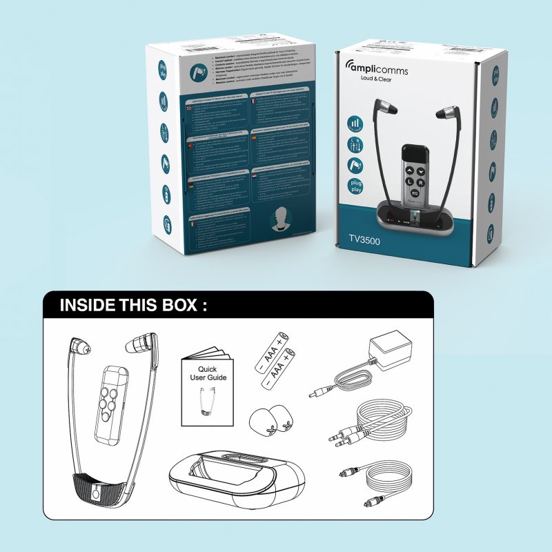 Auricular inalámbrico Amplicomms TV3500 muy ligero para TV con un potente sonido y una solución única de conexión sin cable, fácil e inmediata.
