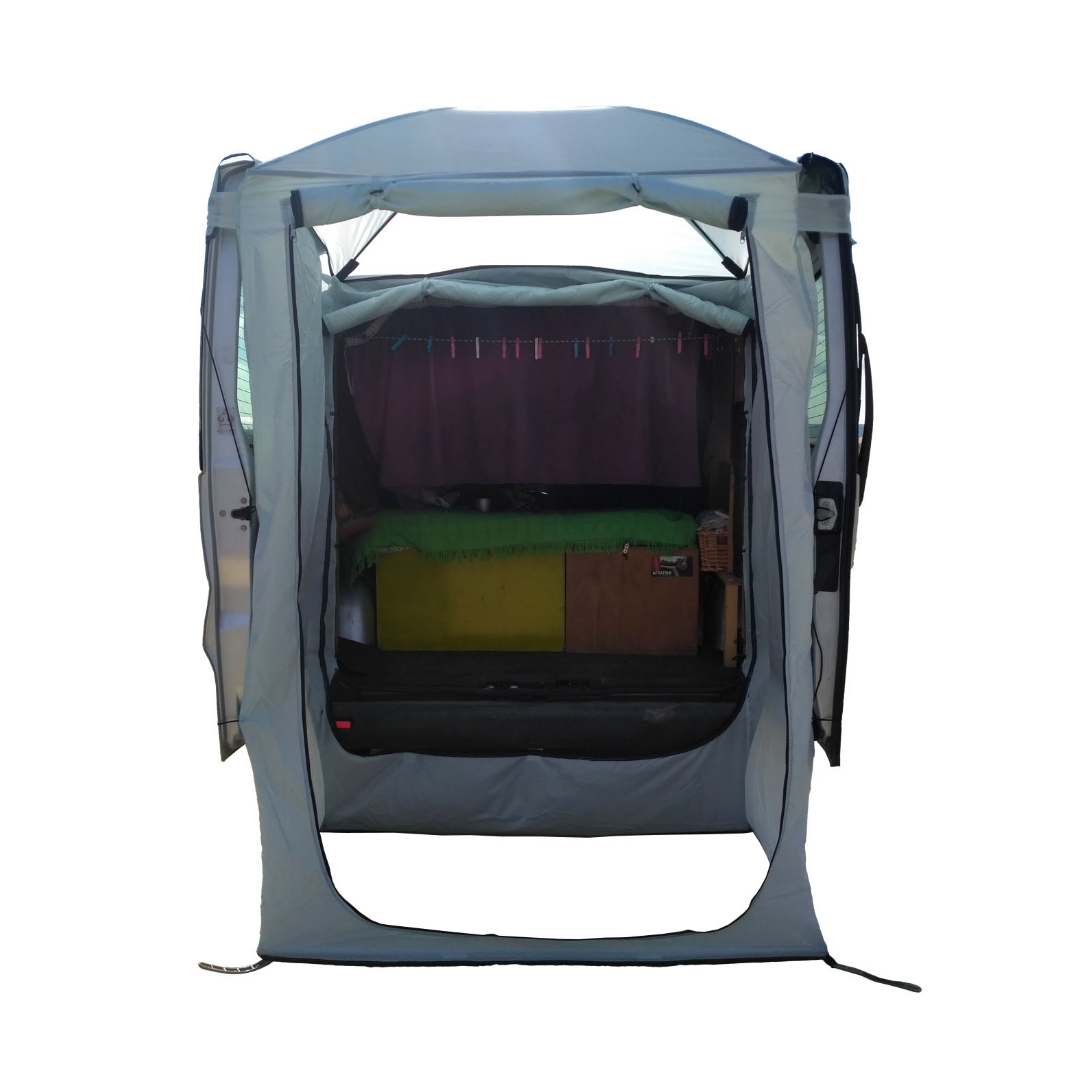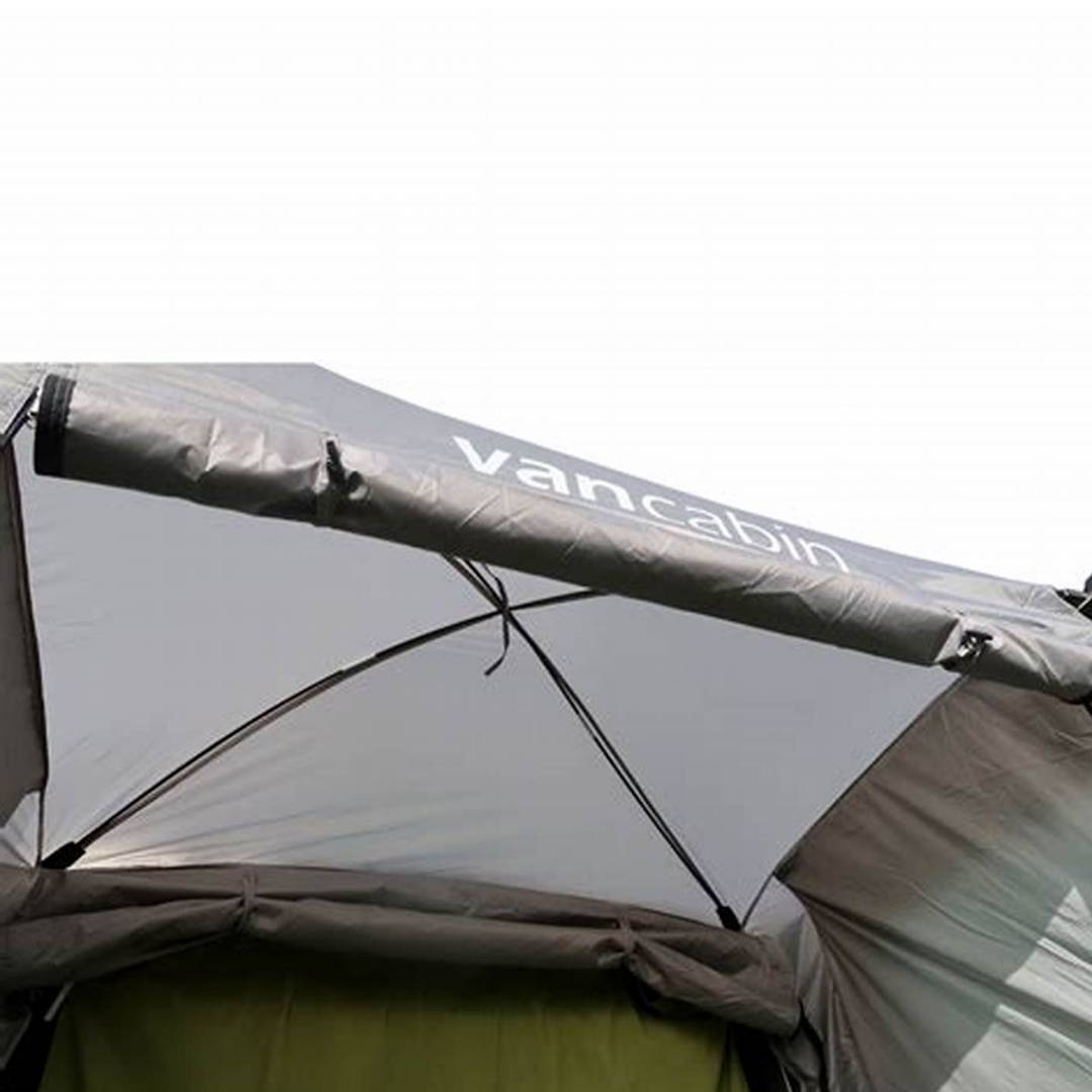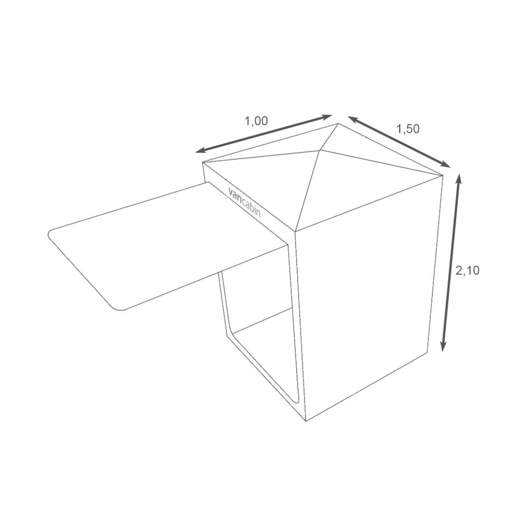 - El techo de la cabina ha sido diseñada para incluir dos varillas que incrementan la altura del espacio interior. Esta solución ofrece la ventaja de poder utilizar la tienda con tablas de surf, esquís u otros elementos voluminosos. Así mismo te permite colgar la ducha o una lámpara en caso necesario.