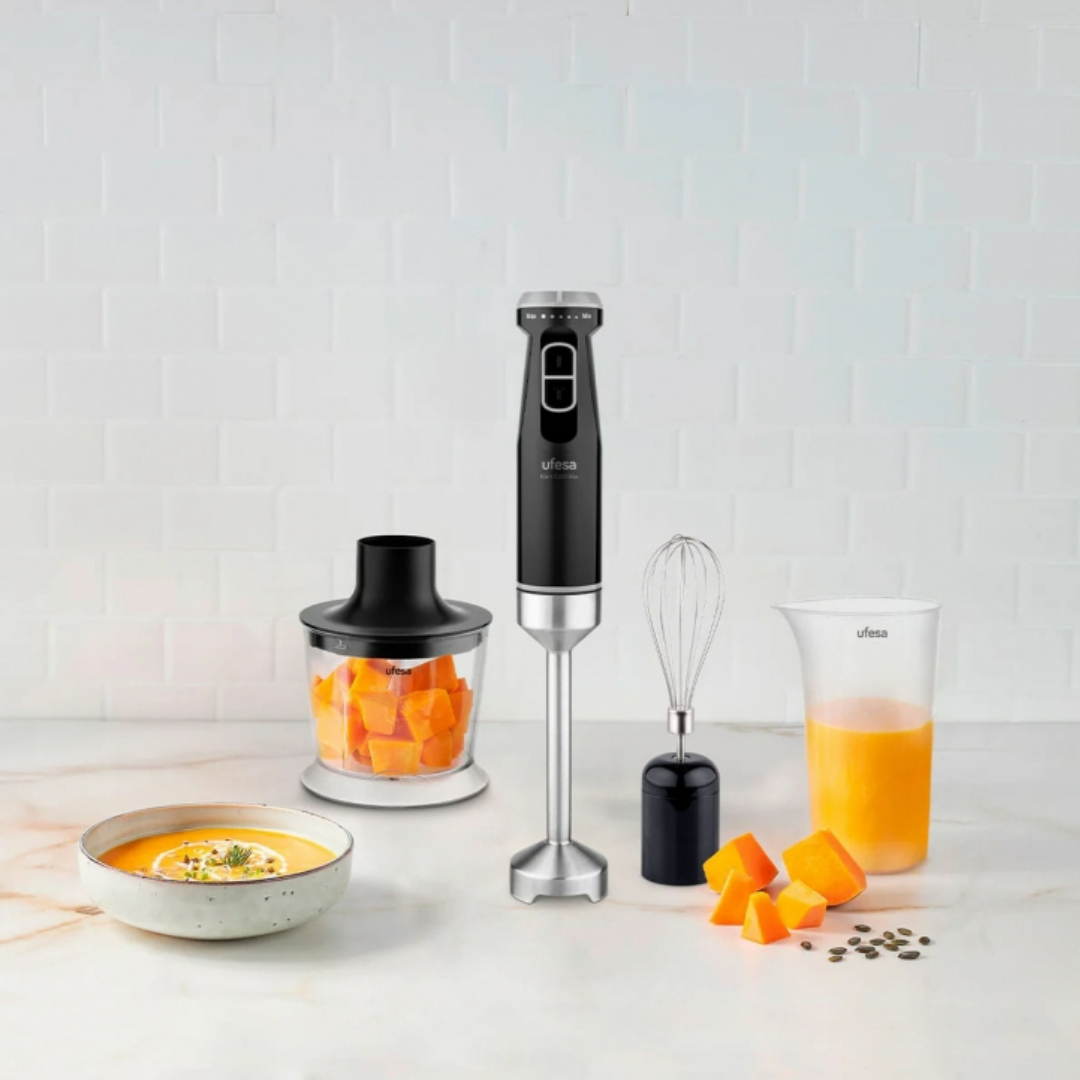 Además, incluye un completo set de accesorios 3 en 1: batidor emulsionador, picadora y vaso medidor, para que puedas preparar desde cremas y batidos hasta salsas o frutos secos picados. ¡Todo con una sola herramienta!