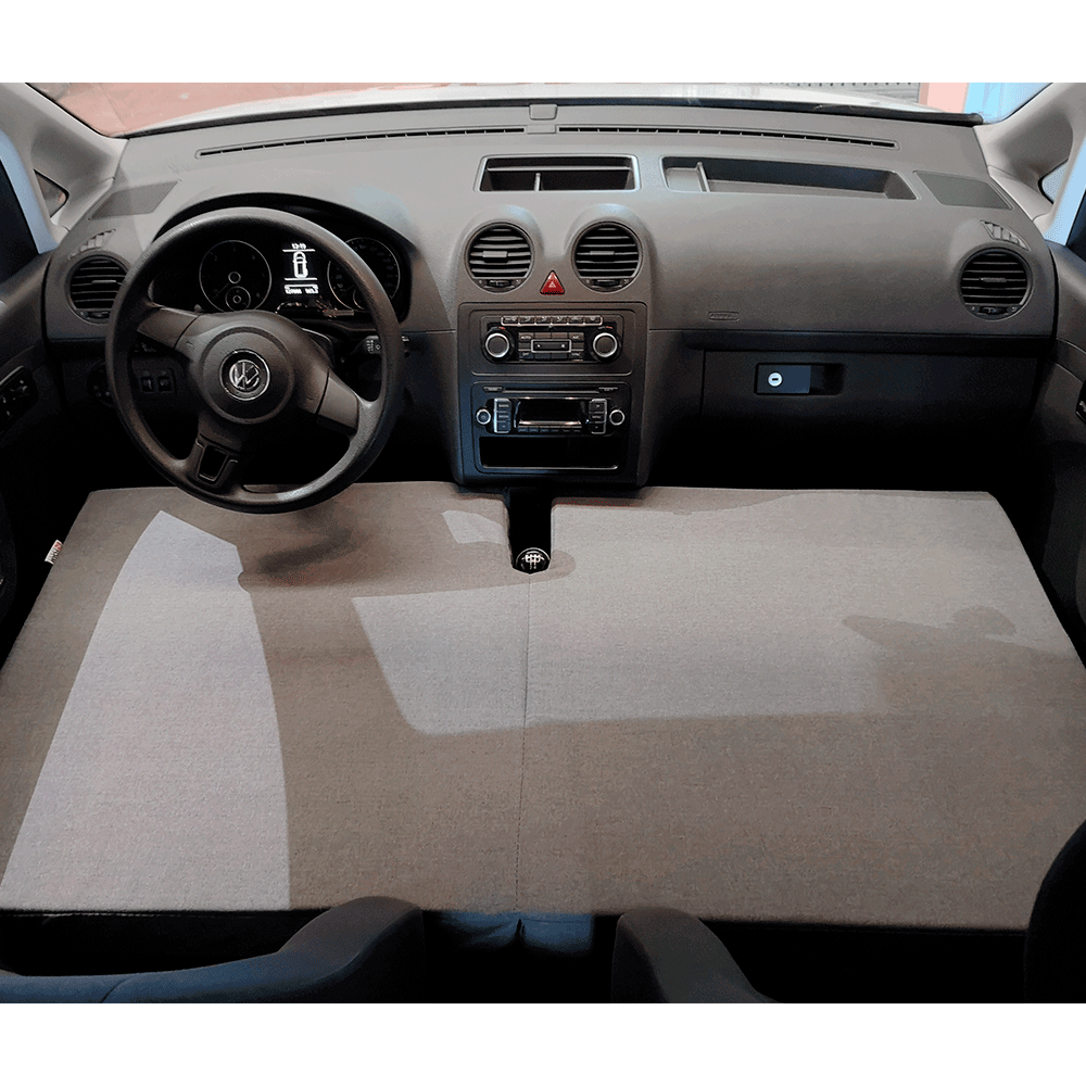 La cama adicional se ensambla en unos simples pasos: despliegue en la cabina, deslícela a su posición, ajuste los asientos delanteros hacia adelante tanto como sea posible, pase el cinturón del pasajero alrededor de la parte delantera de la cama y abróchelo para mayor resistencia.