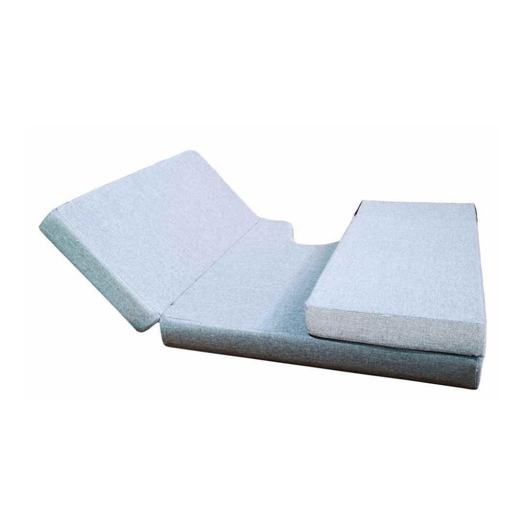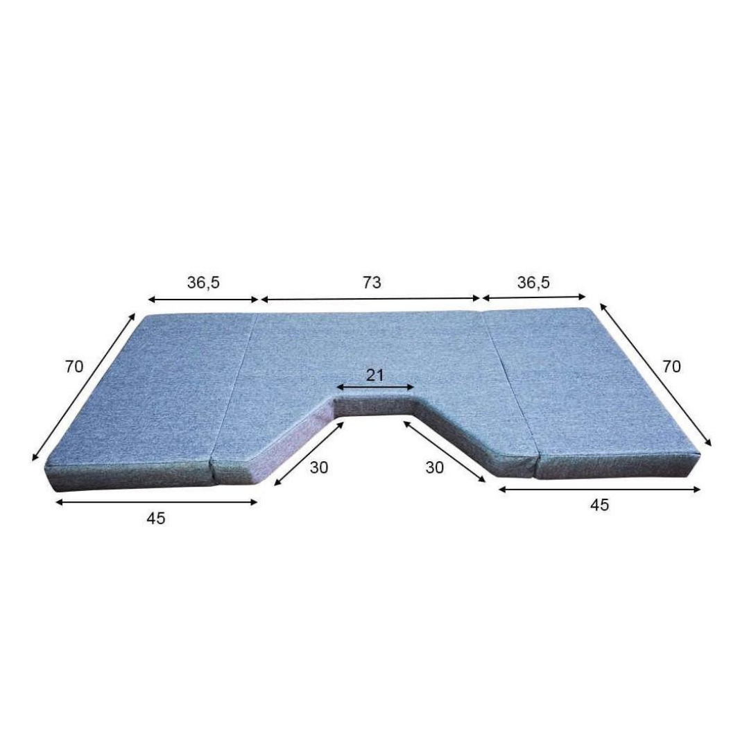 Colchón plegable para cabina de 8 cm de altura fabricado en espuma fría de 7 cm (densidad 25 kg/m3) y tablero de MDF de 1 cm con funda gris.
