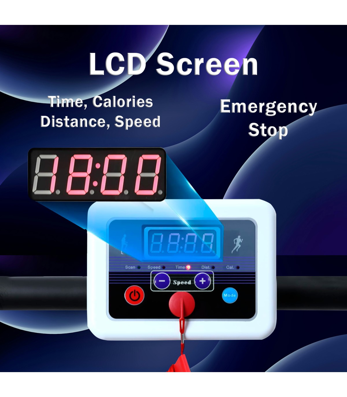 - Pantalla LCD: Velocidad / distancia / tiempo / calorías / scan (control total de su entrenamiento).