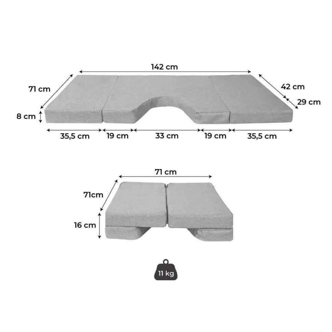 Colchón plegable para cabina de 8 cm de altura fabricado en espuma fría de 7 cm (densidad 25 kg/m3) y tablero de MDF de 1 cm con funda gris.