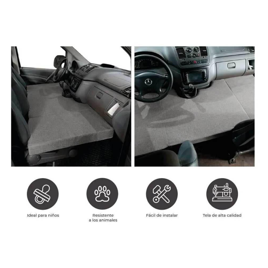 - Montaje Sencillo: Solo requiere ajustar los asientos delanteros, deslizarla a su posición, y asegurarla con el cinturón del pasajero para mayor estabilidad.