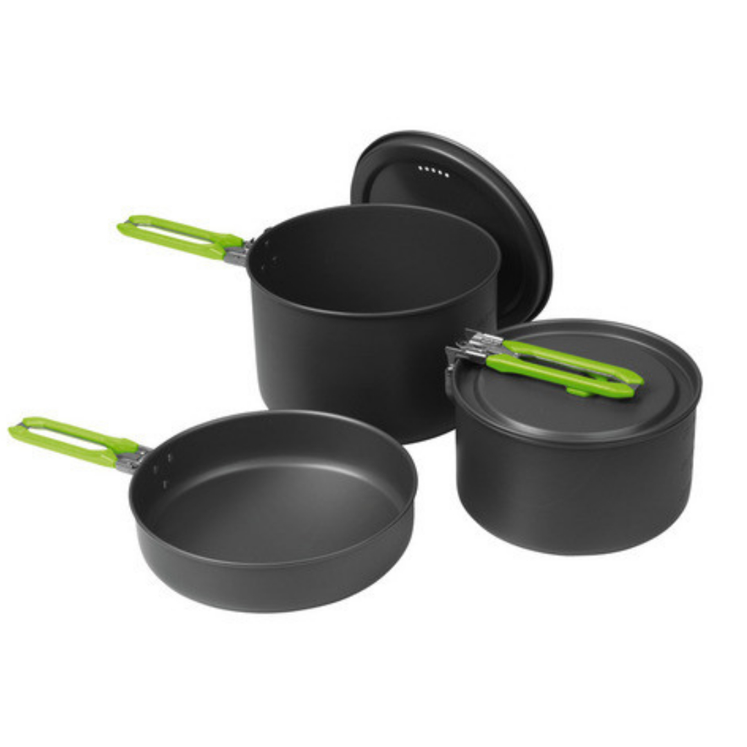 - Ahorro de Espacio: Gracias a su diseño compacto y asas plegables, este set es ideal para lugares con espacio limitado como furgonetas camper y cocinas de camping.
