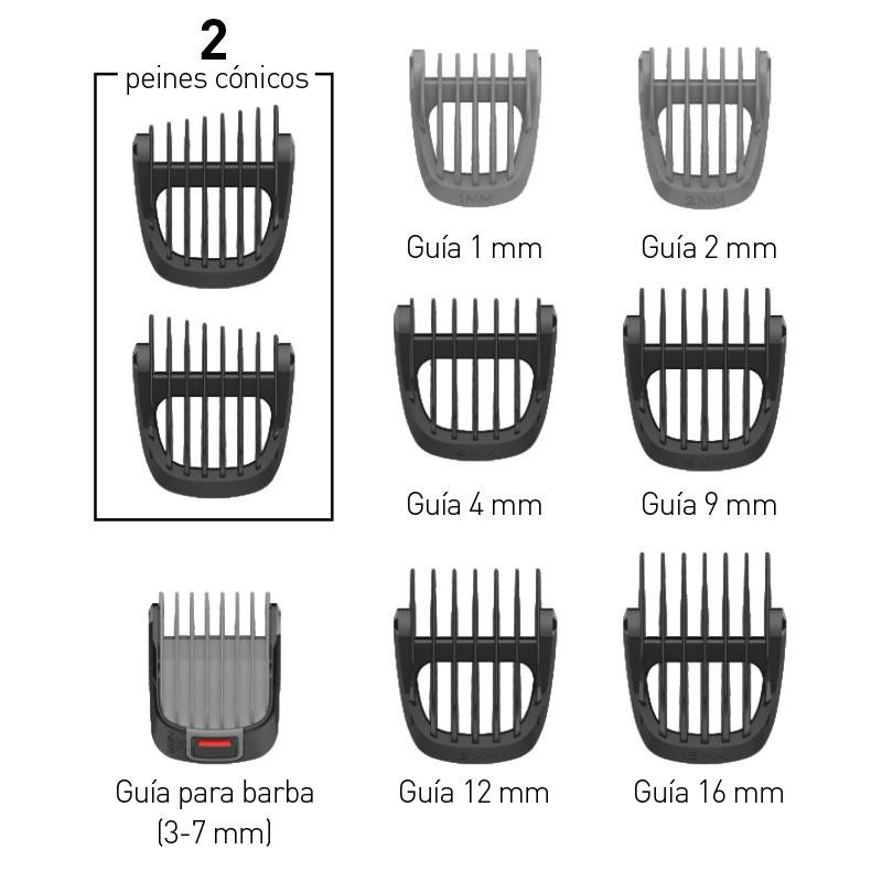 - Seis guías para cabellos 1-2-4-9-12-16 mm.