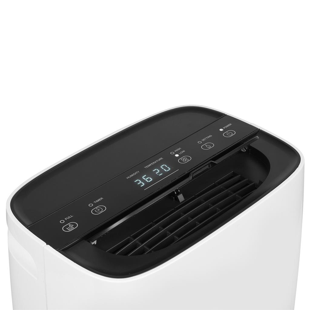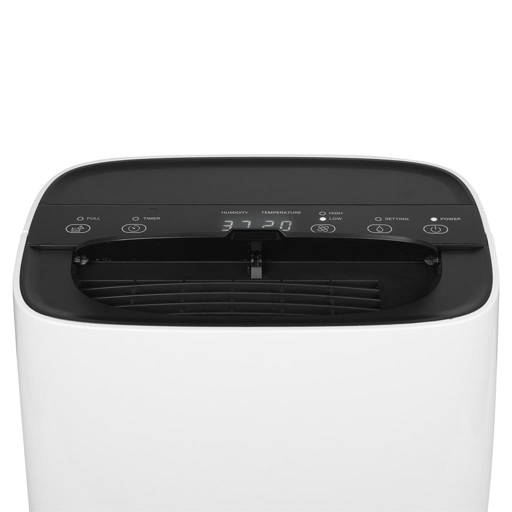 Elegante deshumidificador compacto con función de deshumidificación de 10 litros al día. Fácil funcionamiento del humidistato, indicador de depósito de agua lleno, apagado automático, temporizador 24 horas y depósito de agua extraíble de 2,5 litros.