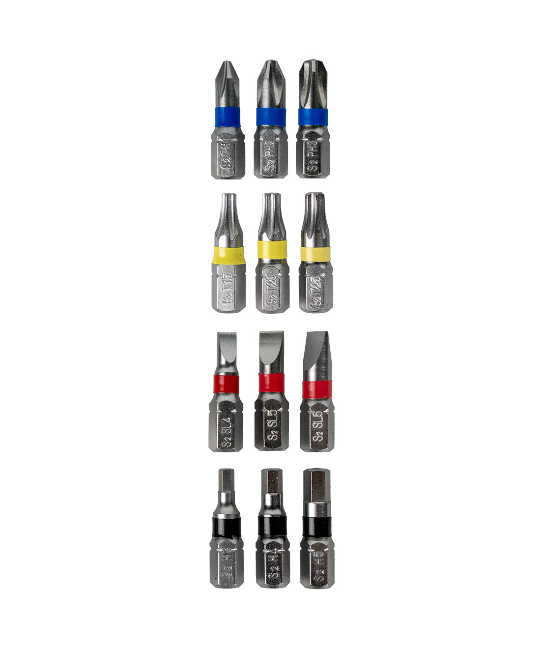 - Destornillador compacto de trinquete con 12 puntas integradas y adaptador.