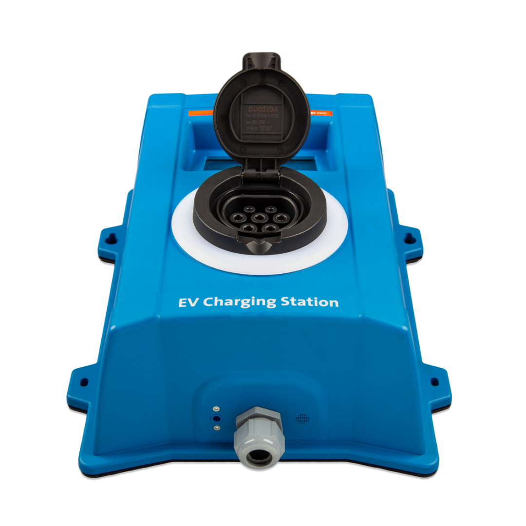 Estación de carga de vehículos eléctricos de alta potencia. La EV Charging Station (estación de carga de vehículos eléctricos) puede operar en trifásica y en monofásica. Proporciona un máximo de 22 kW CA en modo trifásico y de 7,3 kW en monofásico.