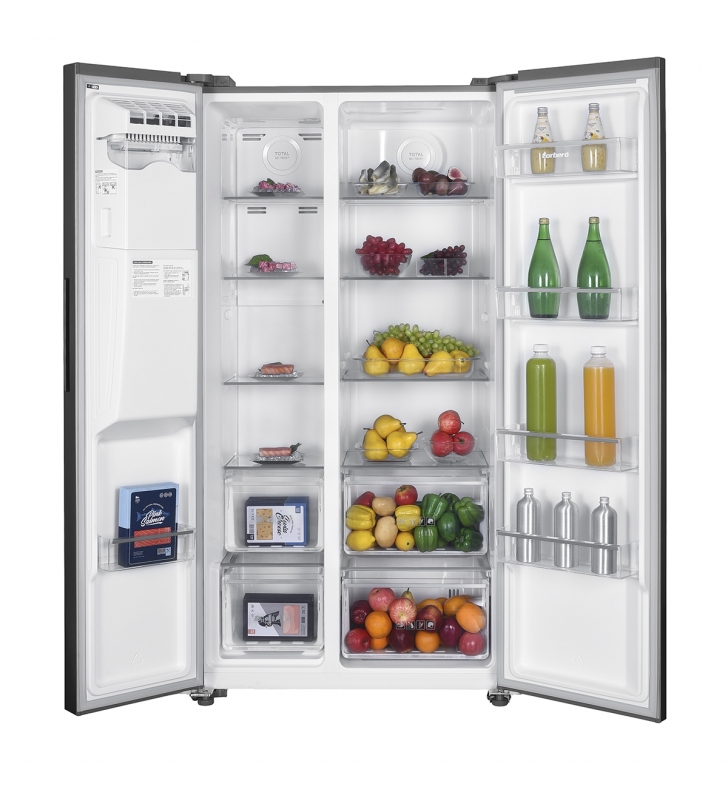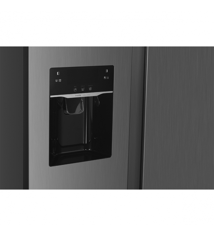 - Equipamiento: Luz interior LED Congelador + Frigorífico. Estantes de cristal. Crisper 4. Huevera. Ice Maker Dispensador de agua y hielo en puerta con conexión de tubo. Ruedas fácil manejo. Patas niveladoras.