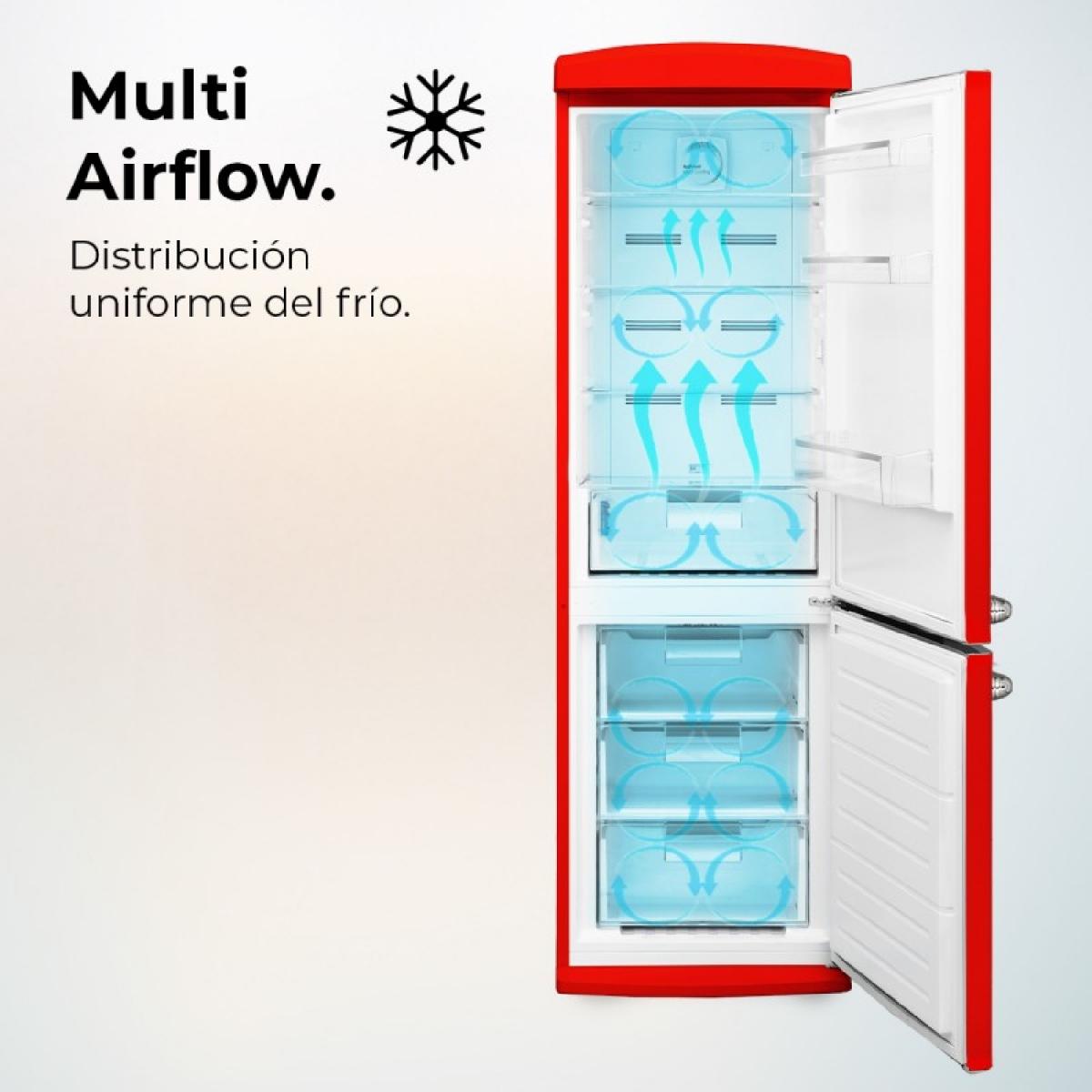 - Multi Airflow: temperatura óptima en todo el compartimento que mantiene la vida óptima de los alimentos por un mayor periodo de tiempo gracias a la distribución uniforme de aire frío.