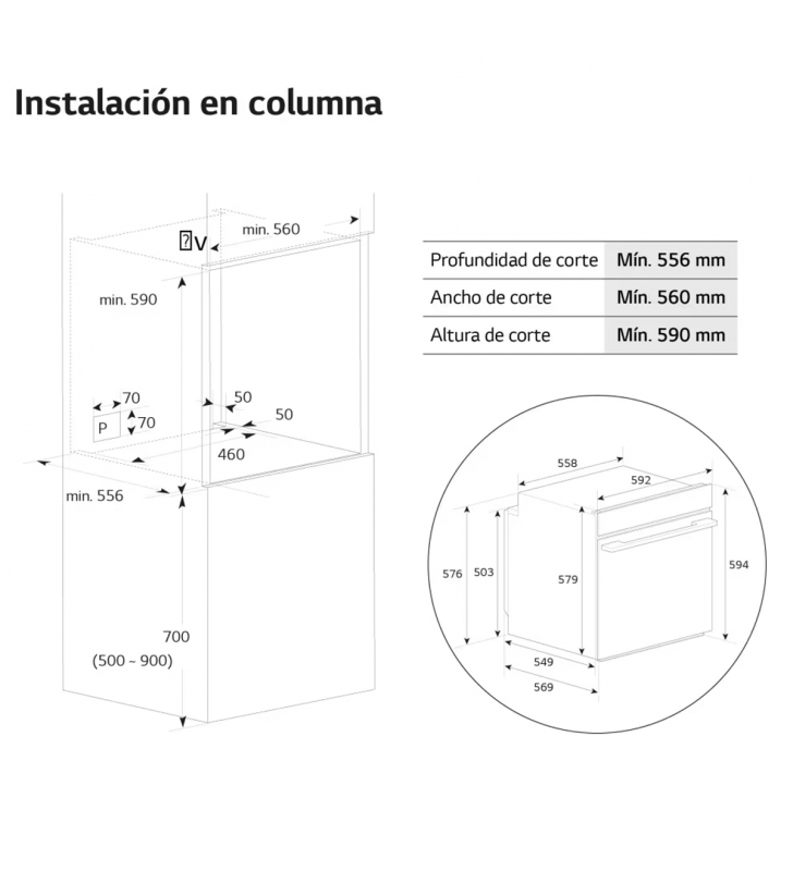 - Tamaño del hueco necesario para la instalación: 590 x 560 x 556mm.