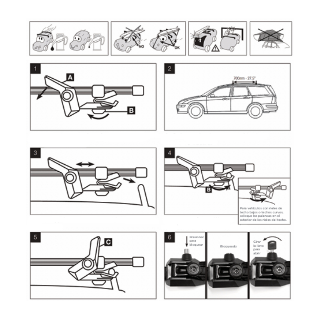 - Los portaequipajes deben estar completamente fijados al techo del vehículo.