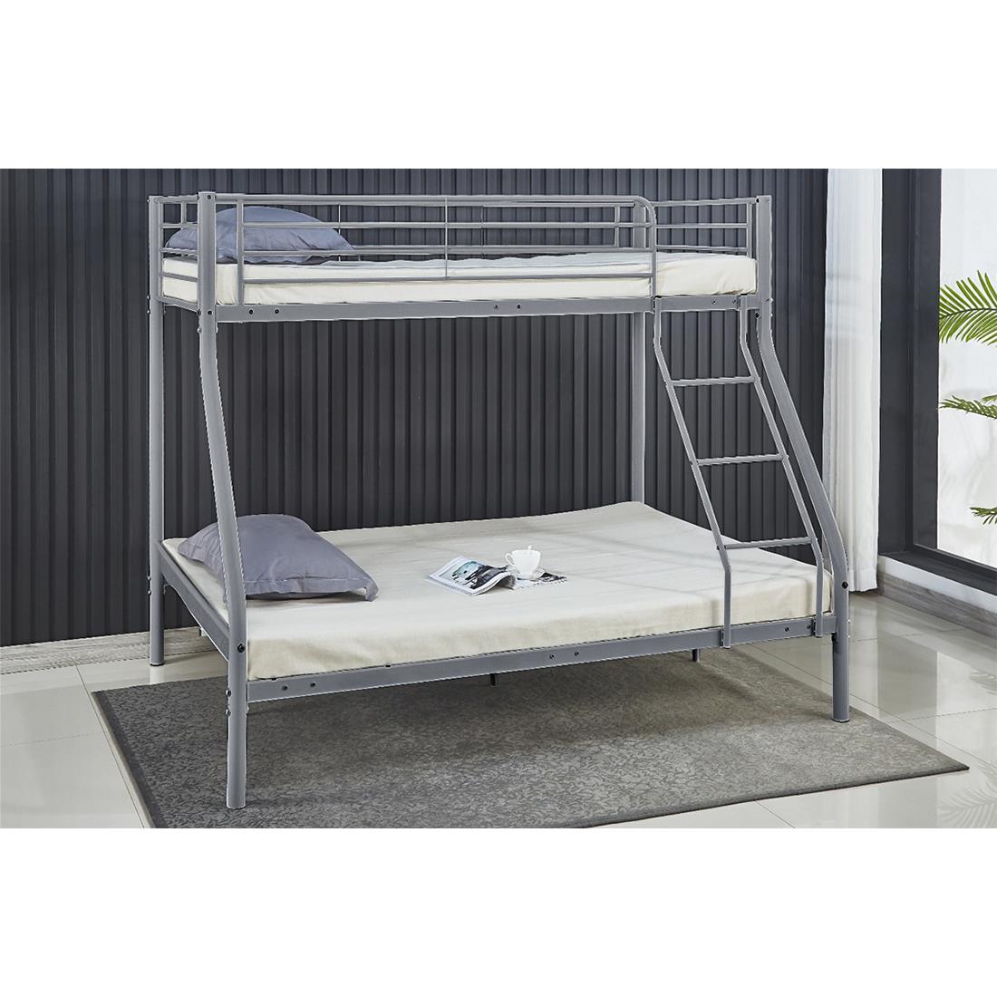 Litera metálica de 90×190 cm en la parte superior y de 135 cm en la parte inferior, con estructura de hierro, escalera y barandillas de protección.