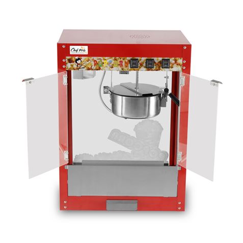 - La CHEF PRO CF0126 es una máquina de palomitas compacta y eficiente, diseñada para cines, bares, ferias, cafeterías y eventos. Su estructura en acero inoxidable y su caldero interior de aluminio garantizan durabilidad, higiene y facilidad de limpieza.