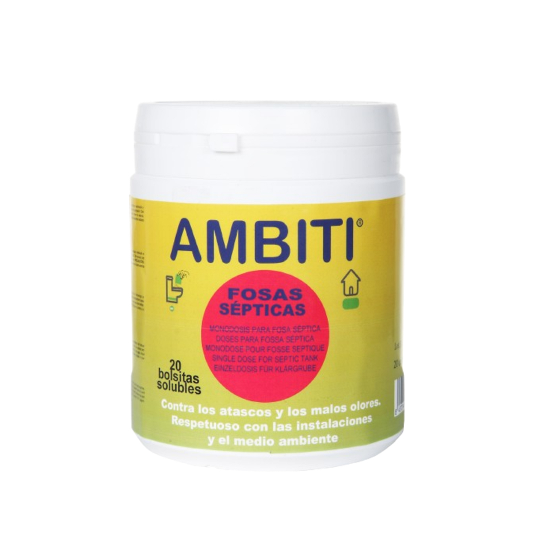 Ambiti Monodosis para Fosas Sépticas es un potente activador biológico elaborado con microorganismos no patógenos, enzimas y nutrientes, diseñado para el mantenimiento y reactivación de fosas sépticas. Disponible en un formato de 20 bolsitas solubles, este producto facilita la dosificación y asegura una limpieza eficaz.