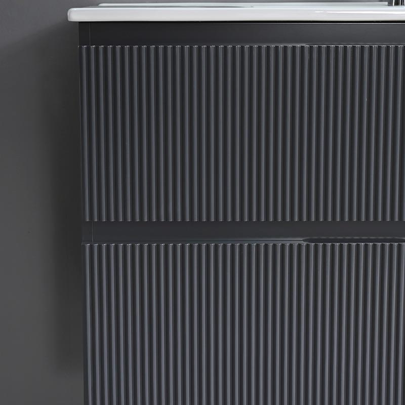 - El mueble suspendido tiene 2 cajones con sistema de cierre progresivo y una puerta con tiradores metálicos con espacio de almacenaje en su interior.