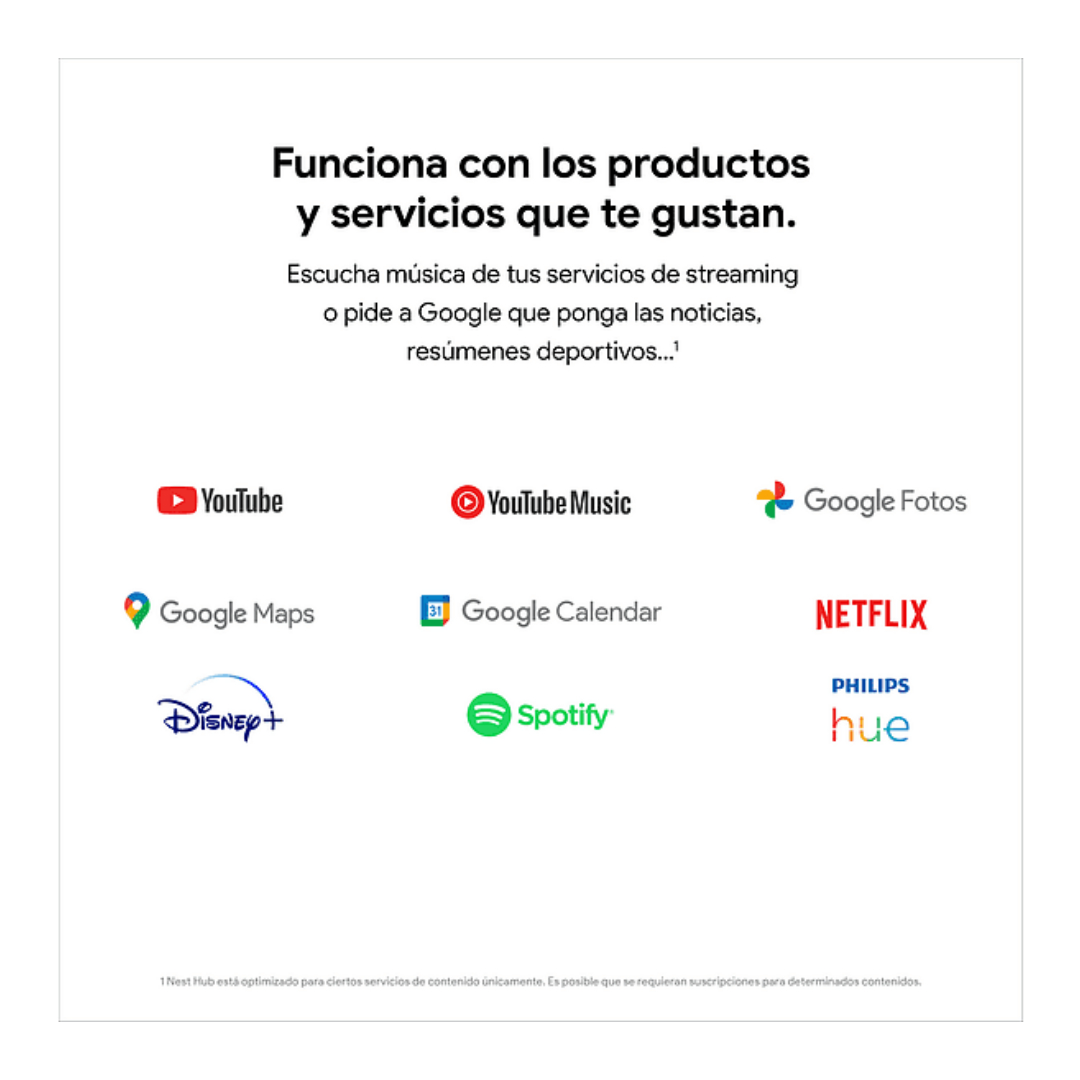 Controla tus dispositivos conectados. El centro de tu hogar conectado. Nest Hub te permite controlar tu hogar inteligente desde un mismo lugar y funciona con cientos de dispositivos compatibles. Enciende la luz o sube la temperatura del termostato con un toque. También puedes pedir a Google que lo haga y recibir ayuda con solo usar tu voz. Nest Hub también funciona con las cámaras y los timbres con vídeo Nest. Solo di «Hey Google, enséñame la cámara de la puerta principal» para ver la transmisión en directo de esa cámara. Se necesitan dispositivos inteligentes compatibles. Nest Cam y los timbres con vídeo Nest se venden por separado.