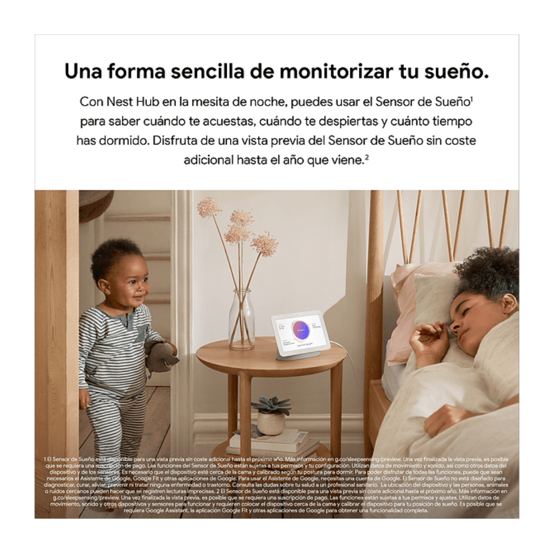 Una forma mejor de despertarse y relajarse. Con Nest Hub en tu mesita de noche, puedes dormirte y despertarte con más facilidad. El brillo de la pantalla se atenúa para crear un ambiente adecuado para el descanso en tu dormitorio. En la pestaña «Tu noche», puedes configurar la alarma, controlar la luz y otros dispositivos conectados compatibles, y reproducir sonidos relajantes que te ayuden a dormir. El Despertador de Efecto Amanecer de Nest Hub te despierta a tu ritmo, y solo tienes que mover la mano cerca de la pantalla para posponer la alarma, gracias a la tecnología Motion Sense.