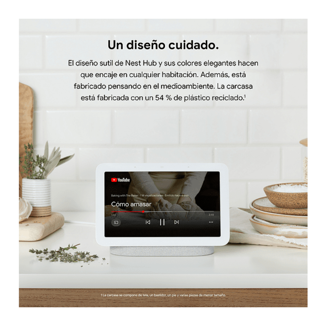 Diseño cuidado, por dentro y por fuera. El sutil diseño de Nest Hub encaja en cualquier habitación. El brillo de la pantalla se ajusta a la iluminación de la habitación para que no sea demasiado brillante ni demasiado tenue. La pantalla muestra automáticamente tus mejores fotos de Google Fotos, por lo que tus favoritas aparecerán de fondo. Nest Hub está fabricado pensando en el medioambiente: La carcasa está hecha con un 54 % de plástico reciclado.