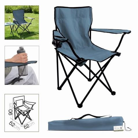 - Silla plegable, con el tradicional diseño de las tradicionales y conocidas sillas de pesca o caza, fabricada con resistente estructura tubular de acero y asiento, respaldo y reposabrazos de tela de poliéster.