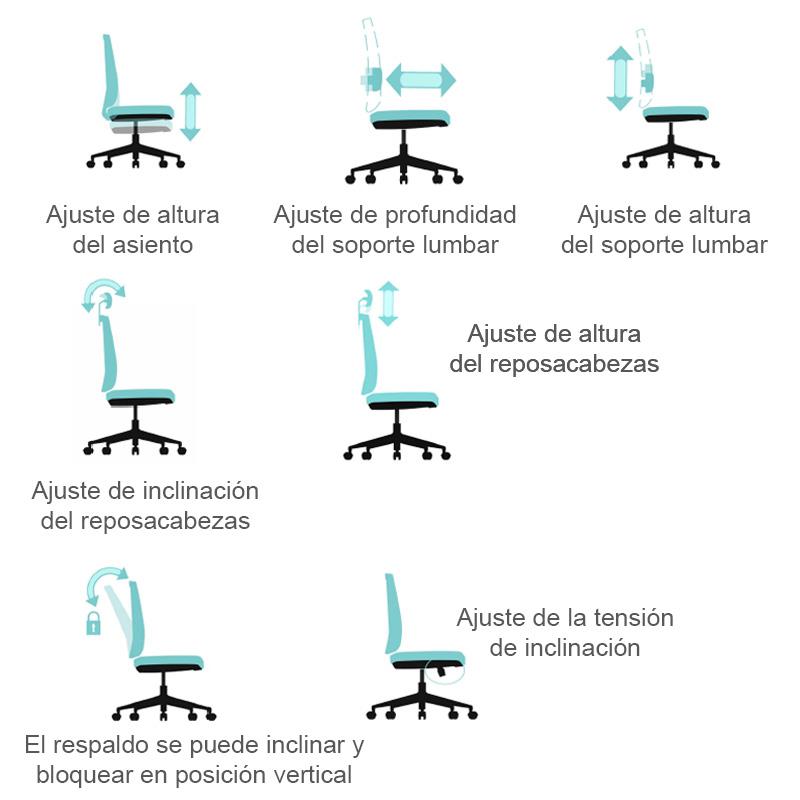 - El soporte lumbar se puede ajustar en altura y profundidad, proporcionando a los usuarios una gran comodidad.