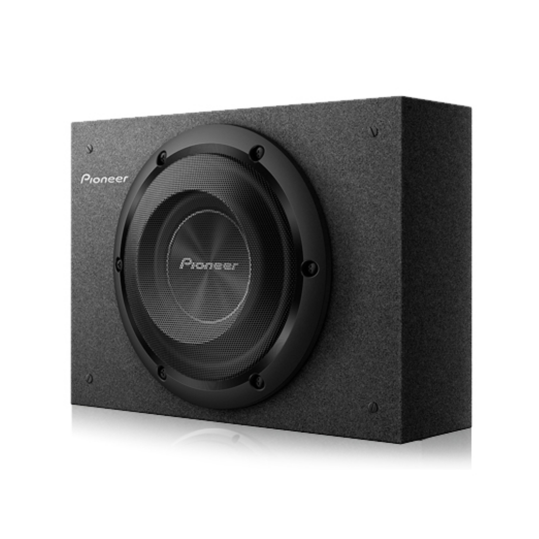 El TS-A2000LB cuenta con una carcasa compacta que ahorra espacio y está diseñada para un uso óptimo del espacio. La carcasa es lo suficientemente poco profunda como para montarla en una amplia variedad de vehículos, incluidas las camionetas con modelos de cabina estándar o extendida. El diseño único de la caja permite montarla en posición vertical o acostada, mirando hacia arriba o configurándose en una posición de fuego hacia abajo. El recinto está completamente alfombrado con un logotipo de Pioneer bordado, lo que crea una superficie antideslizante y resistente a los arañazos.