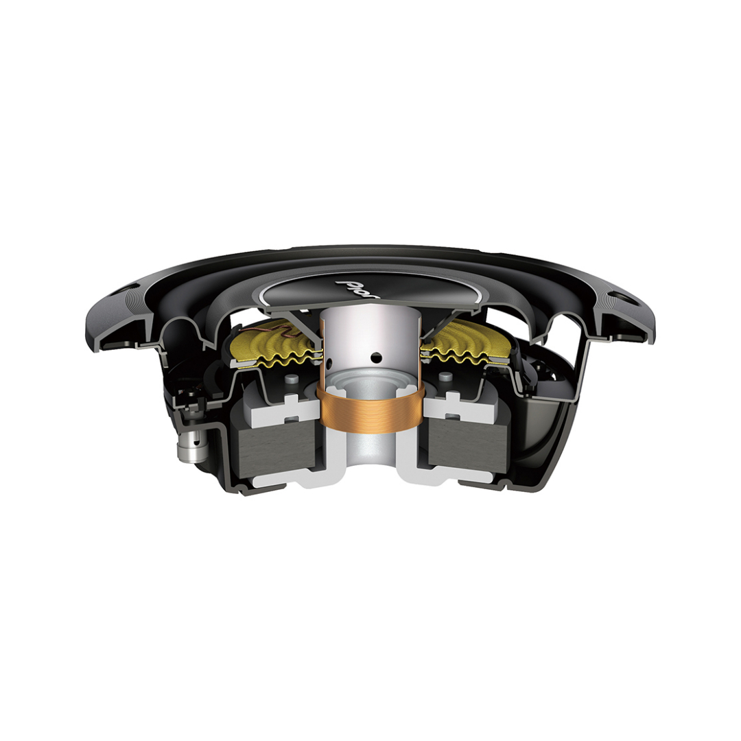Un subwoofer habitual utiliza un amortiguador para controlar la excursión del cono del woofer. Nuestra araña doble resulta más eficaz, dado que necesita menos potencia para mover el cono, al tiempo que produce graves perfectamente detallados y con baja distorsión.