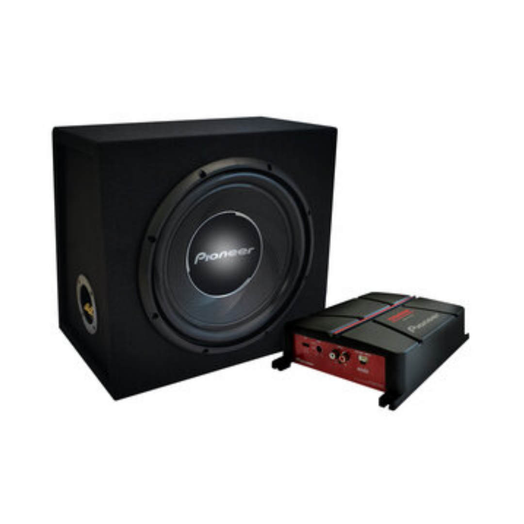El paquete de subwoofer y amplificador GXT-3730B-SET de Pioneer consta de 1 subwoofer TS-A30S4, precargado en una caja cerrada, 1 amplificador GM-A3702 y 1 juego de cables de amplificador para una instalación sencilla.