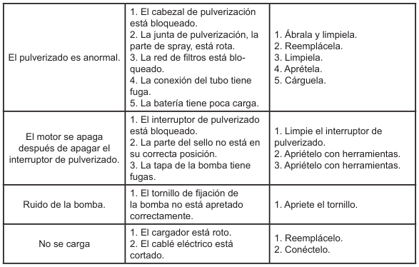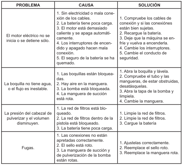 - En estricto cumplimiento con este manual, el usuario debe limpiar los residuos de líquidos del tanque y de la bomba con agua limpia para prevenir daños y contaminación del medio ambiente.