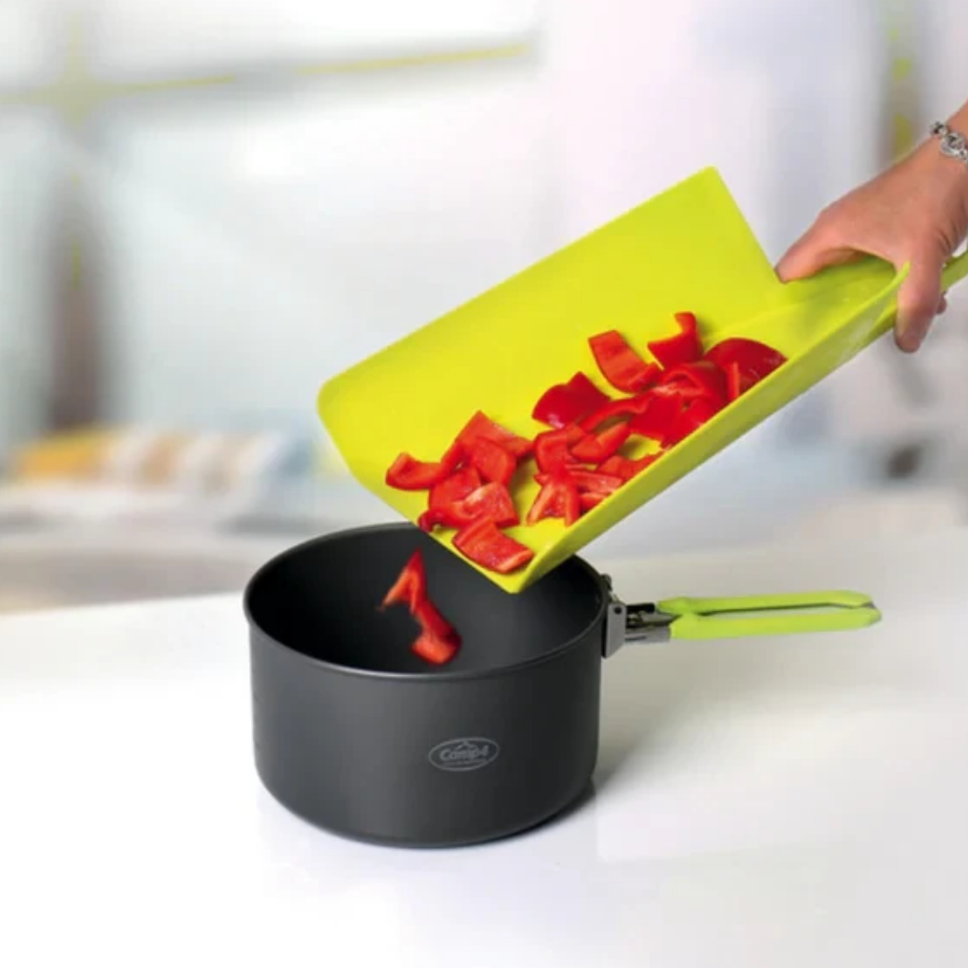 Nuestra tabla de cortar plegable está especialmente diseñada para los entusiastas del camping como tú. Con una superficie hecha de material PP apto para cuchillos, permite cortar sin esfuerzo sin dañar las hojas de sus cuchillos. La función de plegado de la tabla no solo ahorra espacio, sino que también es extremadamente funcional: el material cortado se desliza directamente en la maceta sin caer junto a ella, lo que significa menos desperdicio y menos esfuerzo.